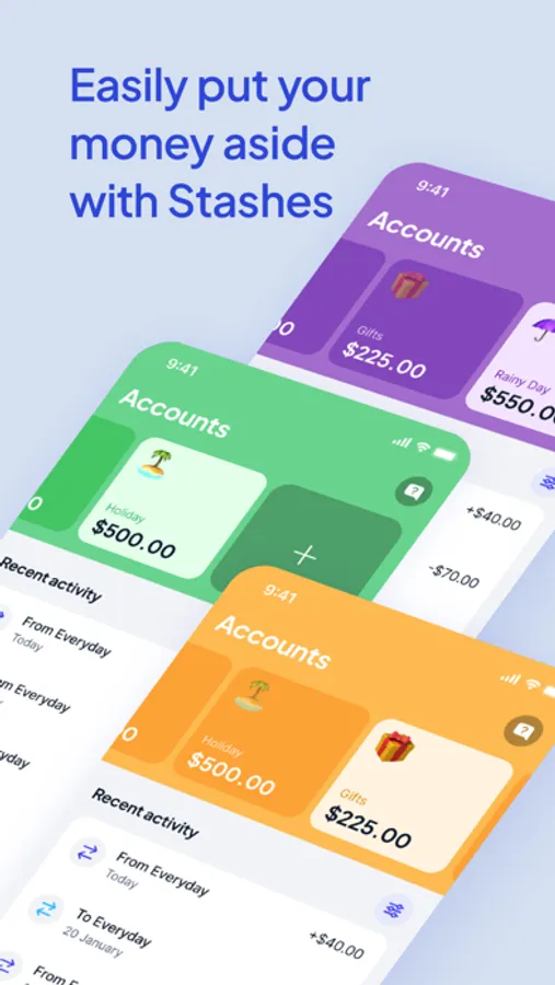 - Create Stashes and put money aside for anything from rent and bills to a holiday or rainy day fund.
