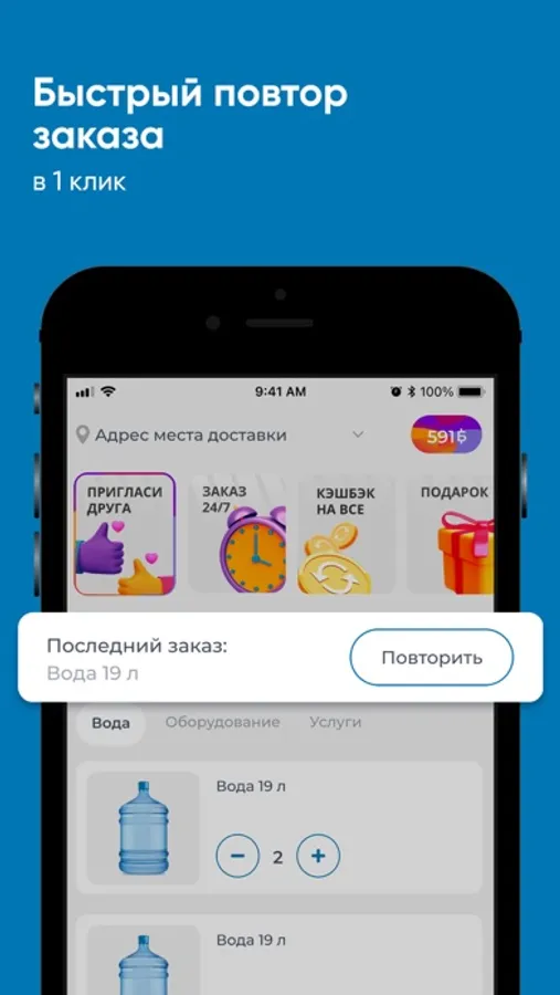 Скачайте бесплатное приложение на телефон и заказывайте чистую воду в удобное время!