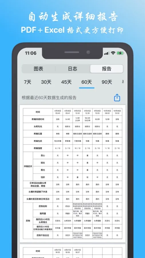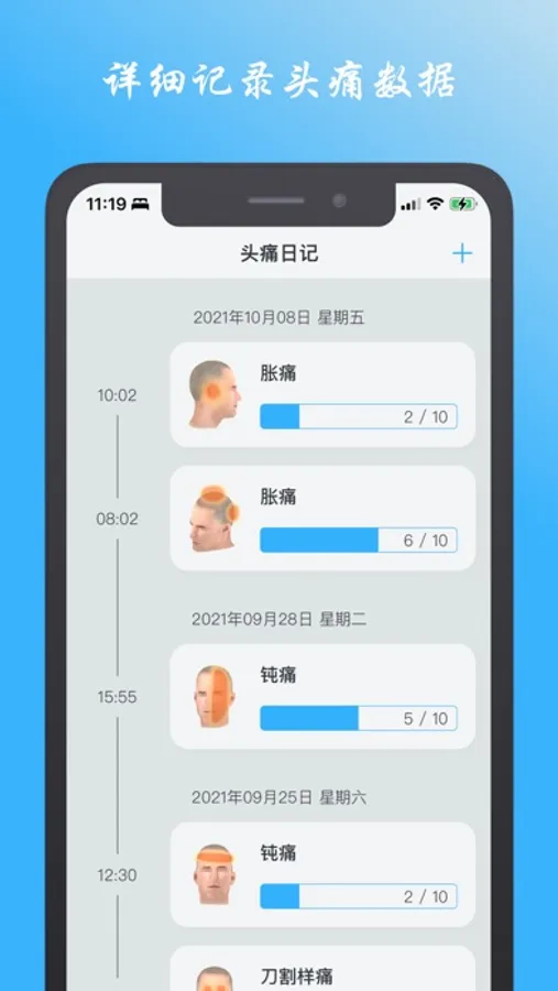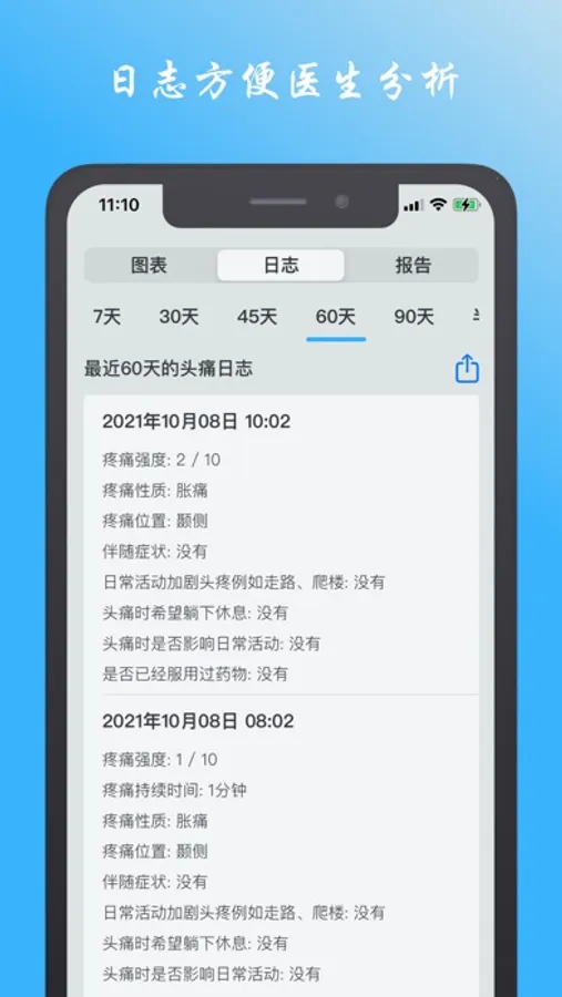 ⌜头痛日记⌟是一款免费且无广告的app,目的在于帮助记录头痛信息并汇总,导出供医生参考。可以随时记录头痛的信息,包括时间,强度,头痛性质,诱因以及头疼位置等20多项信息。App也添加了统计和导出功能,可以导出PDF格式和Excel格式的报告,希望能更有效方便的的帮助头痛的诊断,希望会有所帮助。