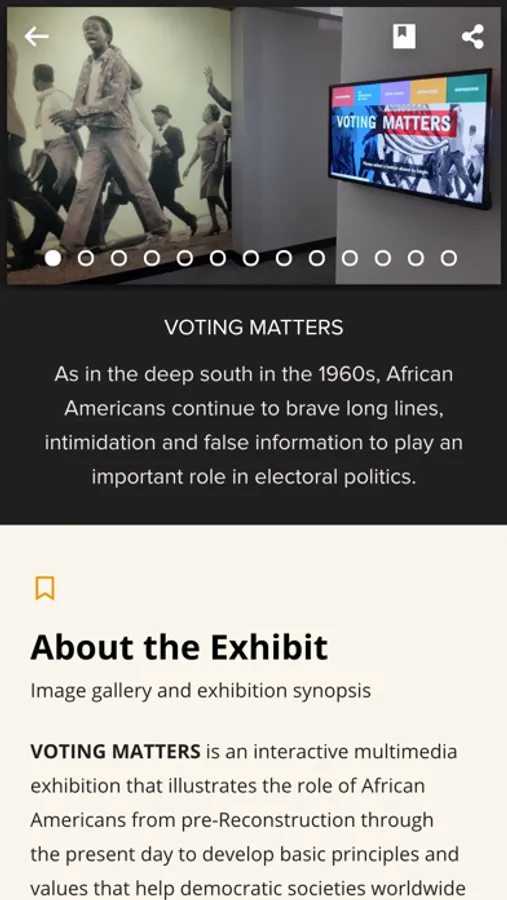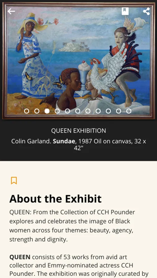 The initial five shows featured are: QUEEN: From the Collection of CCH Pounder; VOTING MATTERS: African Americans and the Vote; The Art of Samuel A. Hodge; Portal of Sankofa: Adinkra Doors; Ibrahim Mahama, In-Between the World and Dreams. Each exhibition has two or three pathways: (1) a rich image gallery, (2) an audio only overview, (3) and short, annotated descriptions of select artifacts."