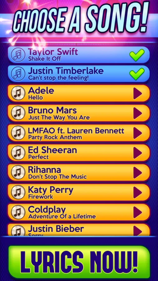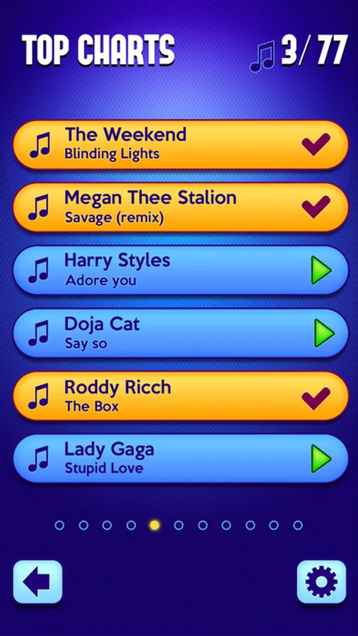 To pass the level you'll have to guess 6 out of the 12 songs of each level. You will be able to ask for a hint to the application, but it will cost you one point.