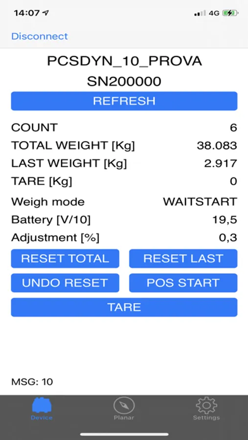 Visualizza numero di pesate, peso totale, ultimo peso e altri dati, invia comandi ed imposta valori.
