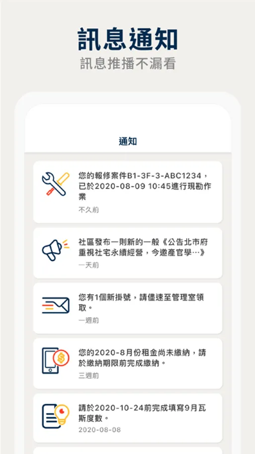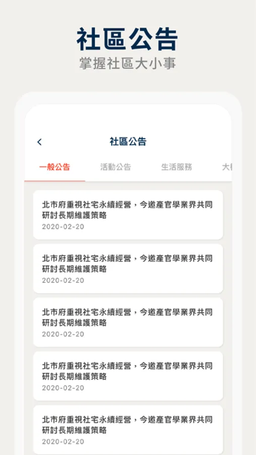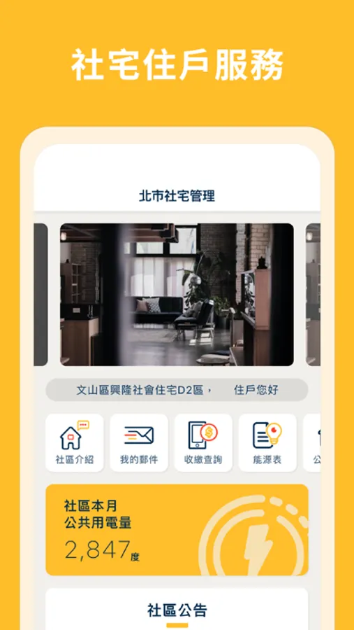 臺北市社會住宅線上服務,提供社會住宅承租戶使用,須有臺北通金質會員帳號及已承租社會住宅之住戶資格,才能登入使用。服務內容包含社區公告、線上報修、意見反映、線上繳費等功能。承租戶可透過APP報修住宅、繳費查詢、郵件通知等,隨時可得知社區最新訊息及各項服務通知。