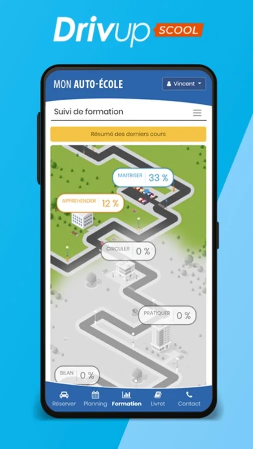 DRIVUP Scool vous permet de gérer votre formation au permis de conduire. De la planification de leçons à la consultation de votre livret d'apprentissage. Gardez également contact avec votre auto-école en la contactant à tout moment.