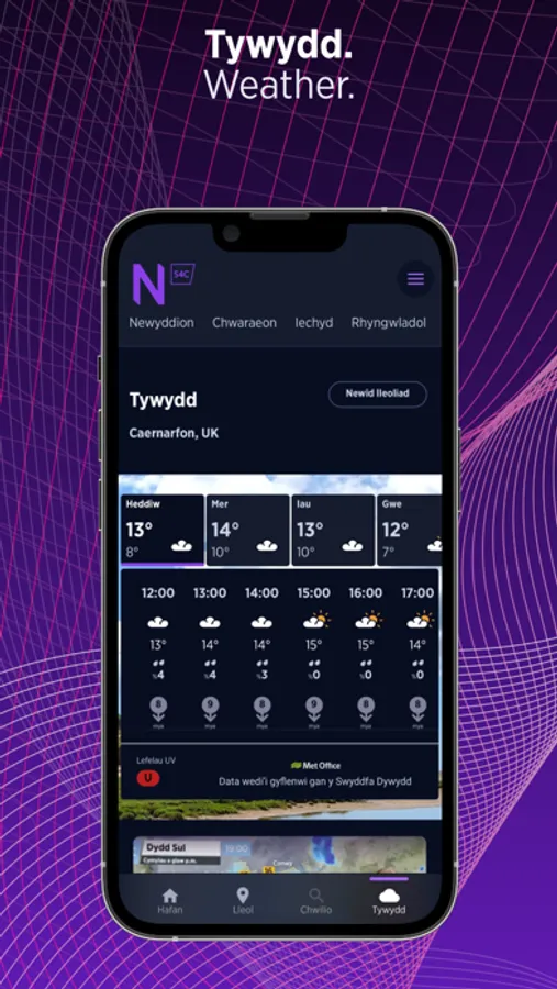 Dyma’r unig wasanaeth tywydd ar-lein yn y Gymraeg mewn partneriaeth gyda’r Met Office. Gallwch weld y tywydd yn eich ardal chi, fesul diwrnod a fesul awr, a’r rhagolygon ar gyfer yr wythnos.