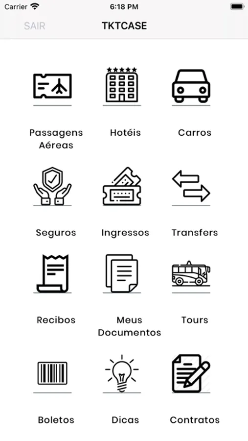 APP porta-vouchers com pastas para cada tipo de documento, passagens, vouchers p/ hotéis, carros, marítimo, shows, tours, serviços e copia de documentos pessoais.