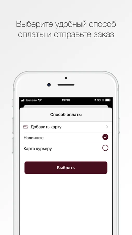 Выберите способ оплаты: Наличными или картой. Примите правила оплаты и нажмите кнопку “Заказать”.