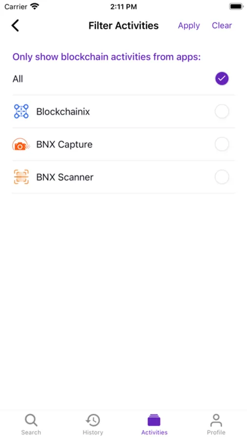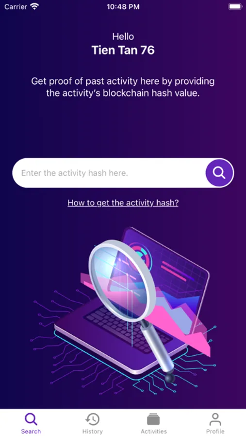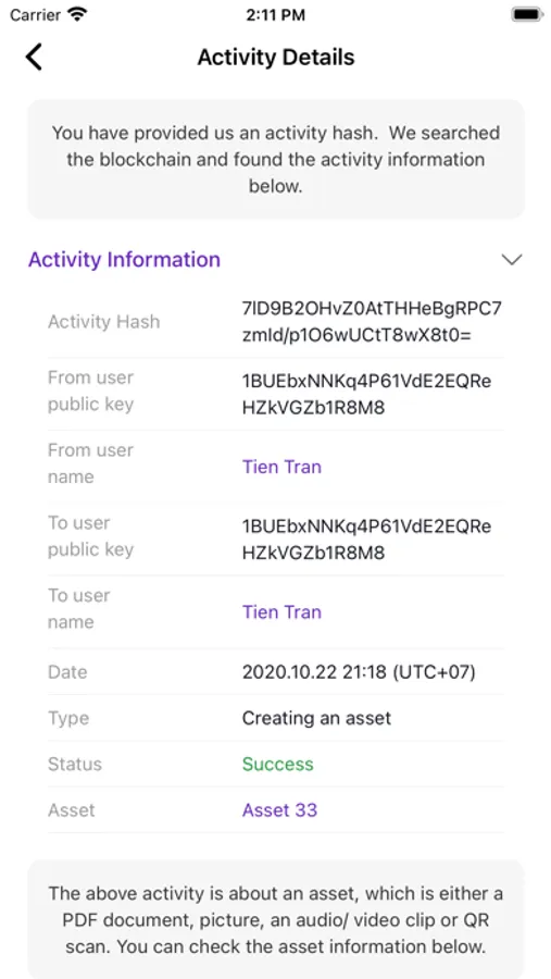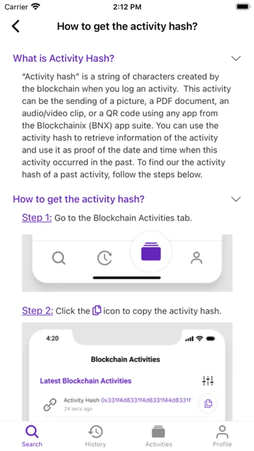 - Get proof of past activity here by providing the activity’s blockchain hash value. “Activity hash” is a string of characters created by the blockchain when you log an activity. This activity can be the sending of a picture, a PDF document, an audio/video clip, or a QR code using any app from the Blockchainix (BNX) app suite.
