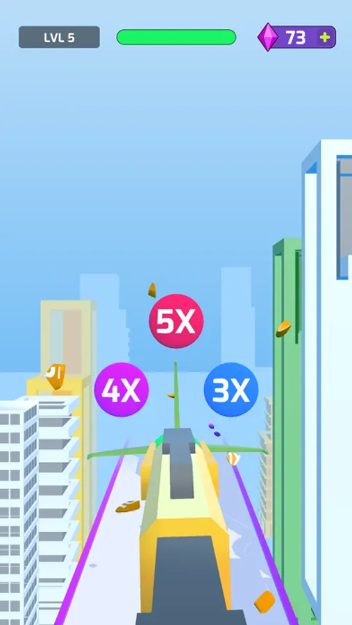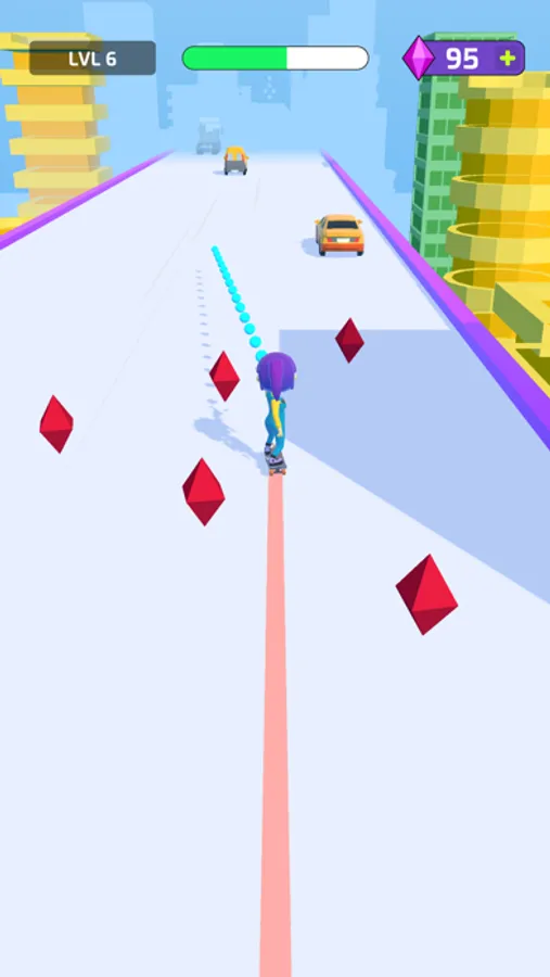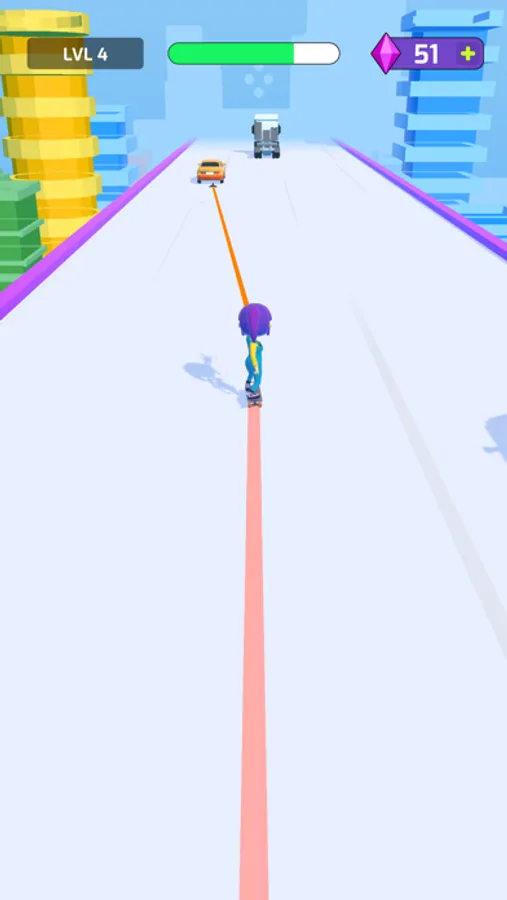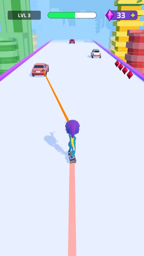 Shoot your sling to hook the moving cars and skate through the traffic. Power ups on your way to add excitement to your surfing experience. Drag your character left or right to avoid hitting any cars or obstacles. Reach the finish line and try to shoot as many bonuses as possible during your super jump.