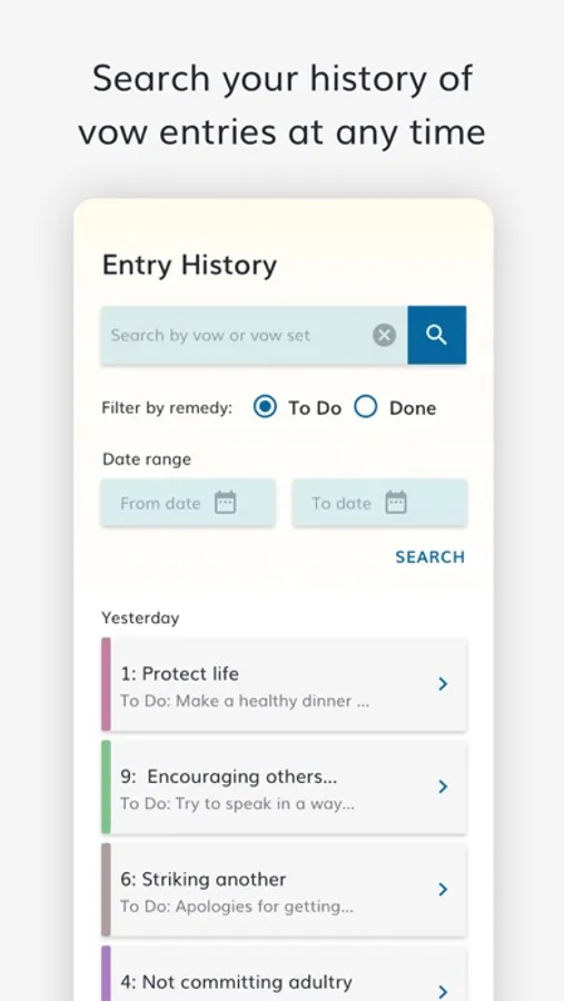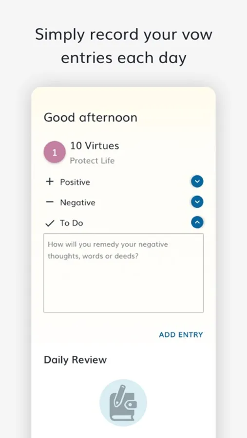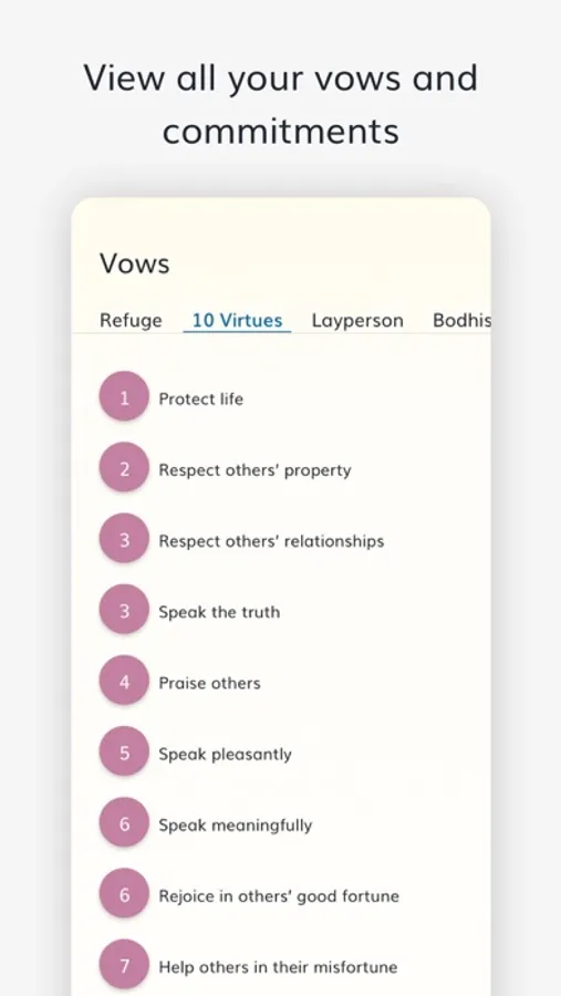The KeepMyVows app allows you to simply and easily keep your six times book practice for the 10 Virtues, as well as Refuge Commitments, Lifetime Layperson, Bodhisattva and Tantric Vows, if you have taken them. You're also able to see a concise list of all your vows and commitments, review your book entries at any time, and keep track of your 'To Dos'.