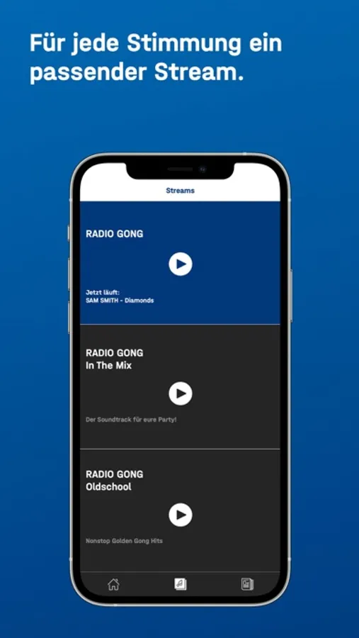 Streams: Du möchtest Musik ohne Unterbrechung hören? Dann sind unsere abwechslungsreichen Streams genau das Richtige für dich. Du hast die Wahl: Das Gong-Programm mit den Würzburg Most Wanted Hits, der Oldschool-Gong Channel mit den Hits der Generation Gong oder der In-The-Mix-Channel mit dem besten DJ Mix von Gong-DJ Tobi Grimm. Für jede Stimmung haben wir den richtigen Sound für dich.