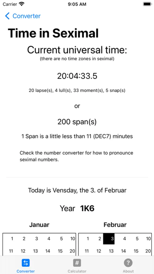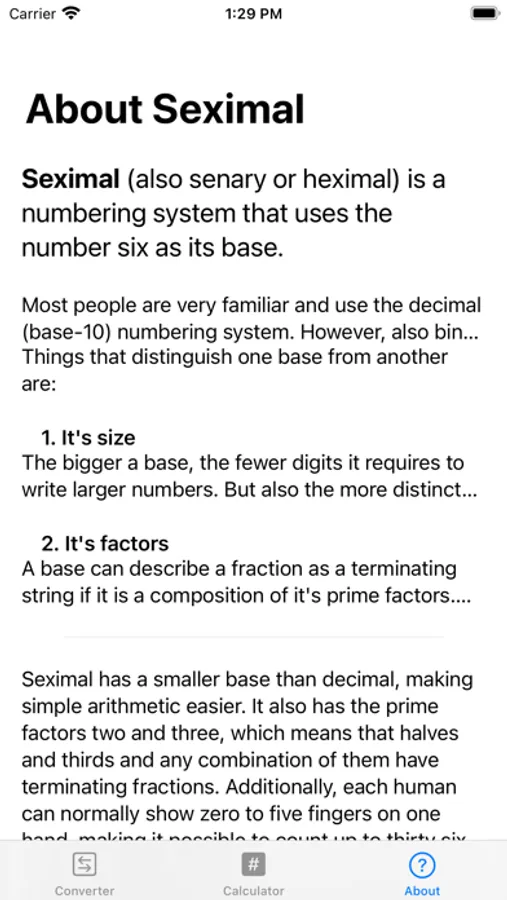 Seximal (also called senary or heximal) is a numbering system that uses the number six as its base. This app provides a glims into what our world could look like if instead of using decimal, we used seximal.