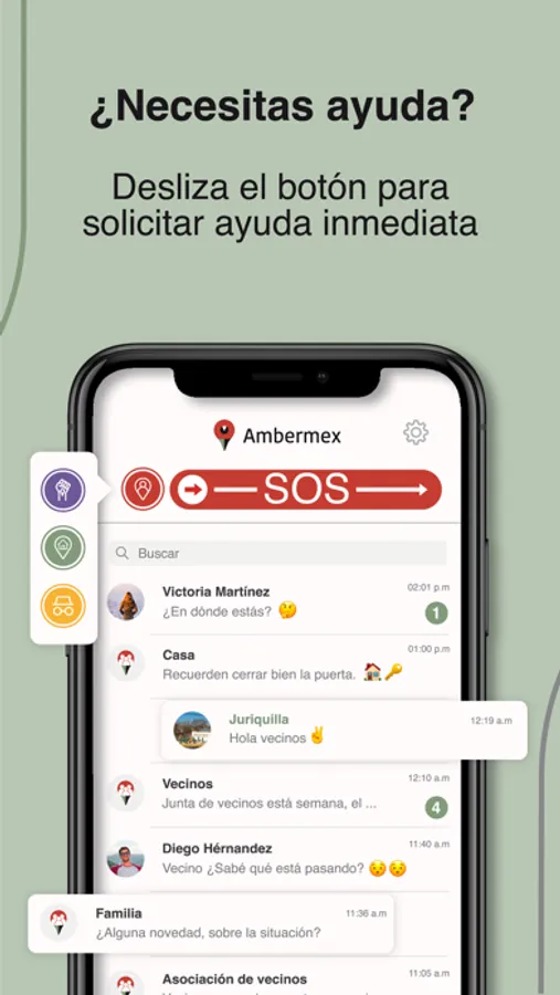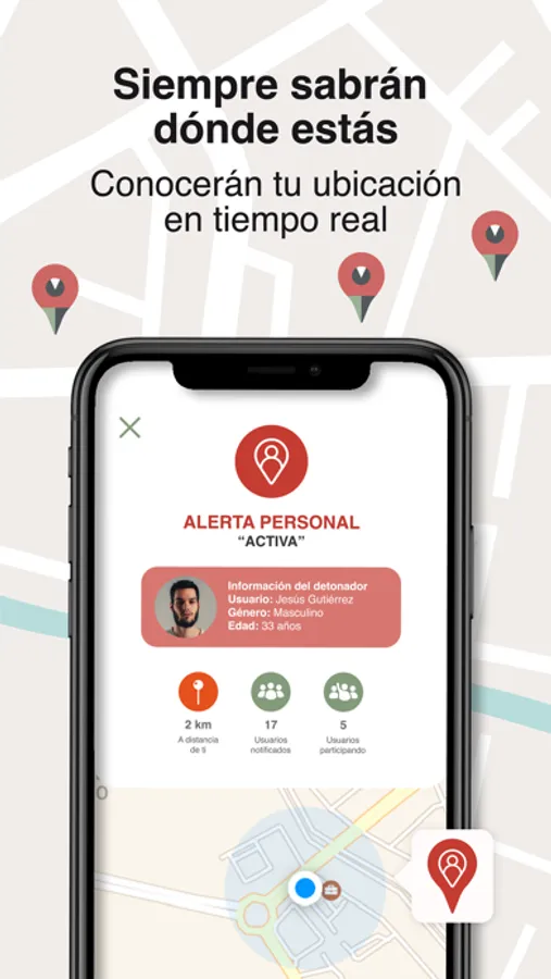 Canal de emergencia: al activar se notificará a usuarios en distancia de ayuda y contactos de emergencia, quienes podrán estar en contacto constante durante la emergencia y ver tu ubicación en tiempo real.