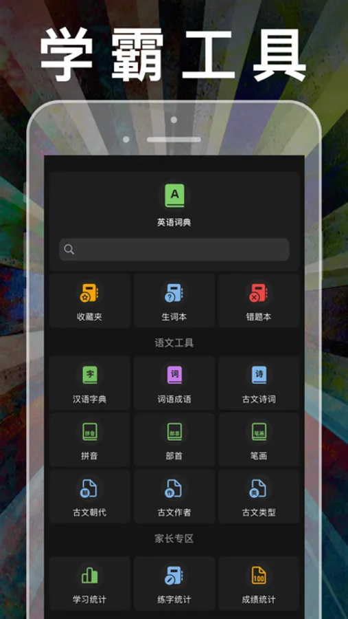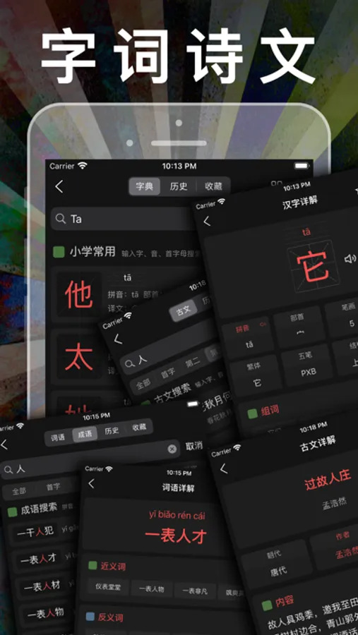 3、汉语字典、拼音、笔画、边旁部首搜索功能;
