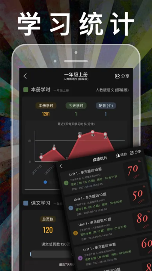学习成就:图表统计学习情况,孩子的学习情况、训练成果五目了然。