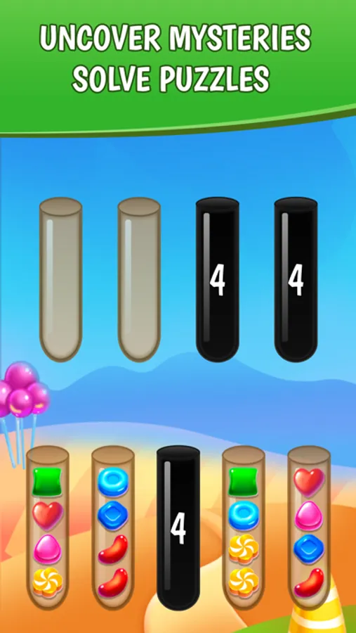 Unleash your strategic thinking and logic as you strive to organize the colored balls until each tube contains balls of the same color. But beware! Some tubes are shrouded in mystery, with only the number of balls displayed on their surface. Can you deduce the hidden colors and conquer the challenge?
