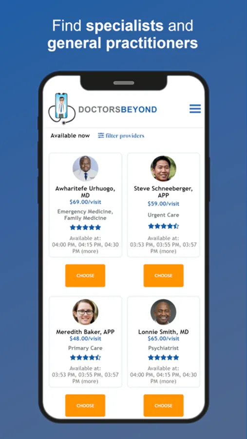 We are a secure mobile platform where patients and US board certified doctors meet with the purpose of obtaining and providing medical services and prescription. We offer Urgent Care, Primary Care and Mental Health by video, audio or chat. Your prescriptions are sent to the pharmacy closest to you all in a few clicks. Our doctors are board certified in Emergency Medicine, Urgent Care, General Practice, Primary Care, and much more. We treat over 98% of conditions online that does not require a procedures.