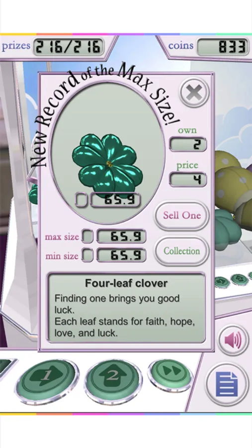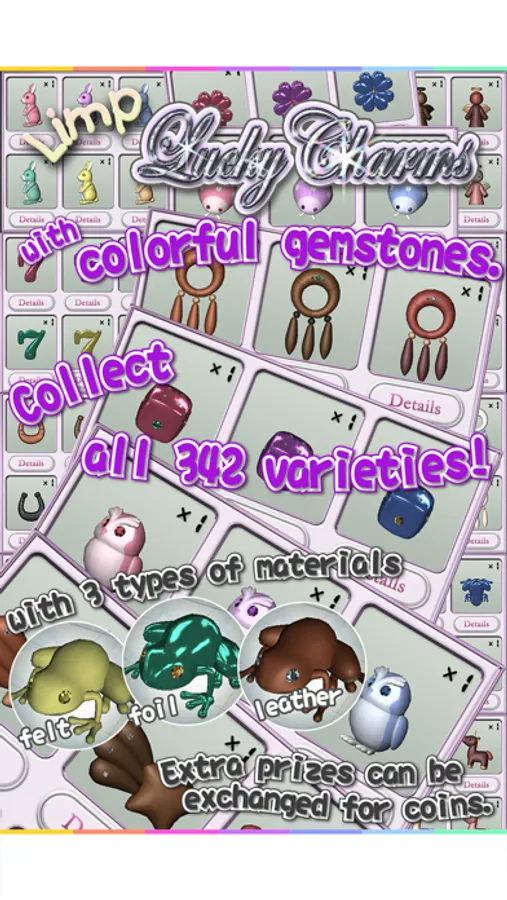 The prizes are good luck charms and lucky animals of all the ages and countries. Four-leaf clovers, ladybugs, unicorns, and so on. A variety of cute plush toys that will bring you good luck. The more you play, the more lucky you feel!