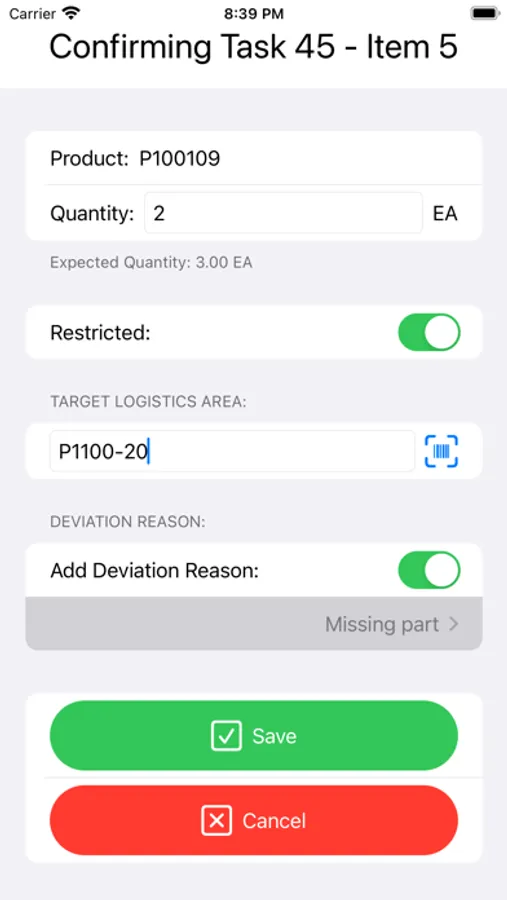 The app supports scanning the target logistics area, defaulting based on the task if defined in the logistics model and works offline.