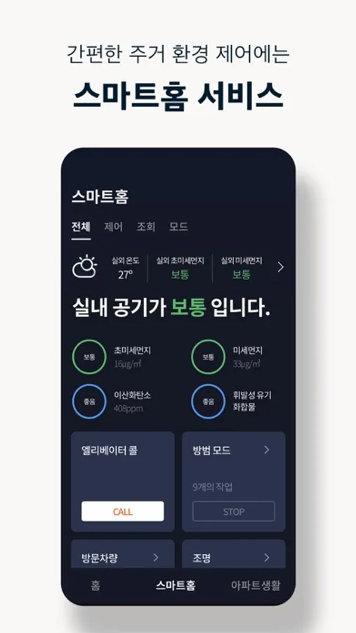 - 조명 난방, 환기, 엘리베이터 콜 등 세대내 공간 및 기기를 손쉽게 제어