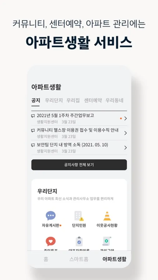 - 공지사항, 자유게시판 등 아파트 주요 소식 실시간 확인 및 이웃과 소통