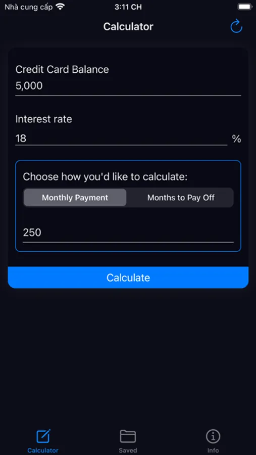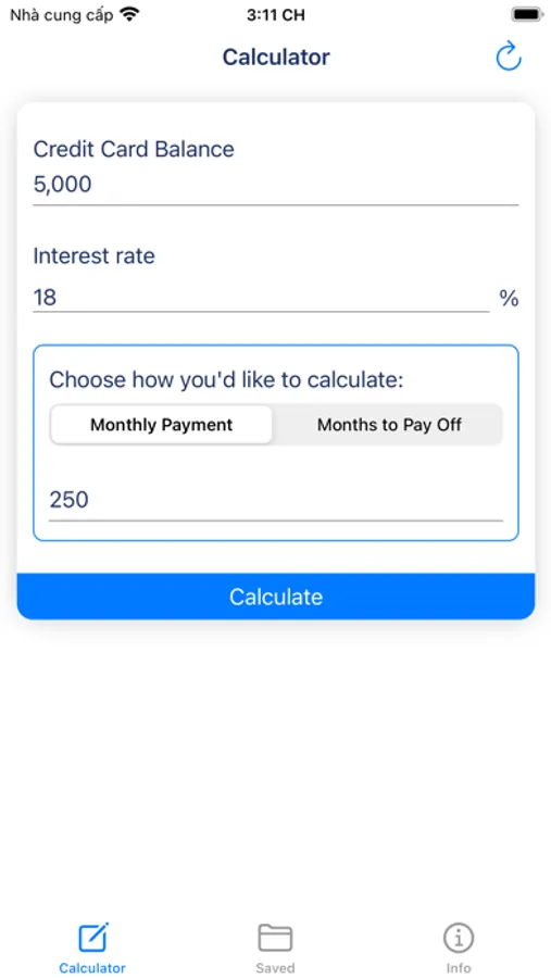 Use this App to calculate your Credit Card payments. Simply enter Credit Card Balance and Interest, we provide options to calculate Months to Pay Off or Monthly Payments. This App is very intuitive and easy to use.