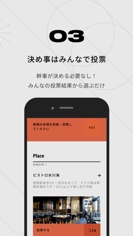 企画を進めていく時には、グループのメンバーで投票していきます。幹事は投票の多いものに決定するだけで簡単に投票をおこなうことができます。