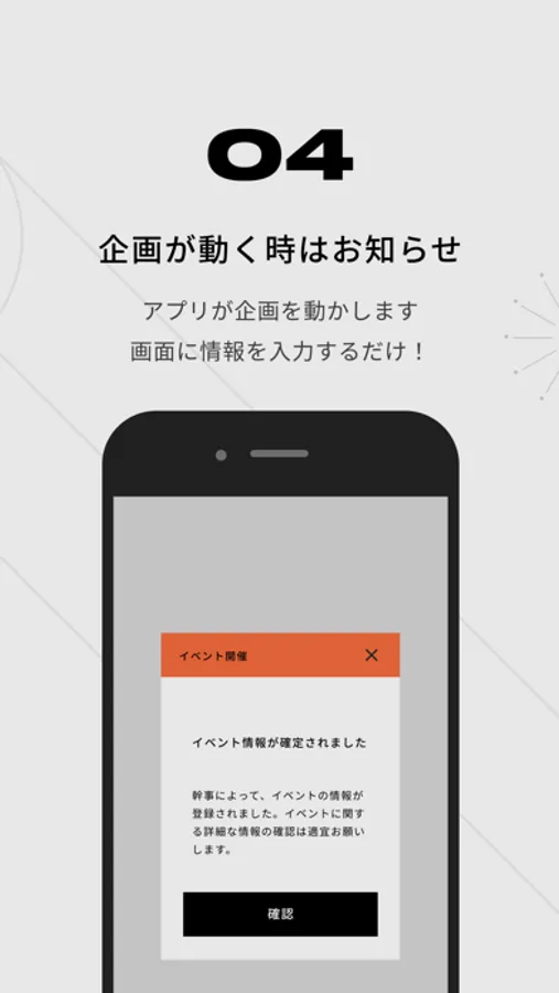 イベントでの動きは通知でお知らせします。イベントは参加者全員で作り上げるようになっているため、幹事へ集中する負担がなくなります。