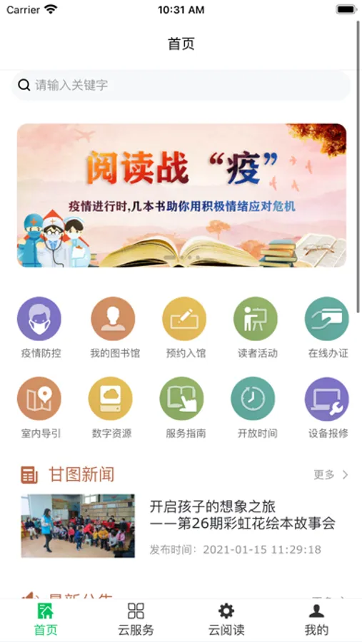 智慧甘图APP是一款数字阅读平台,为用户提供云阅读和云服务,主要功能包括我的图书馆、预约入馆、在线活动、读者活动等。