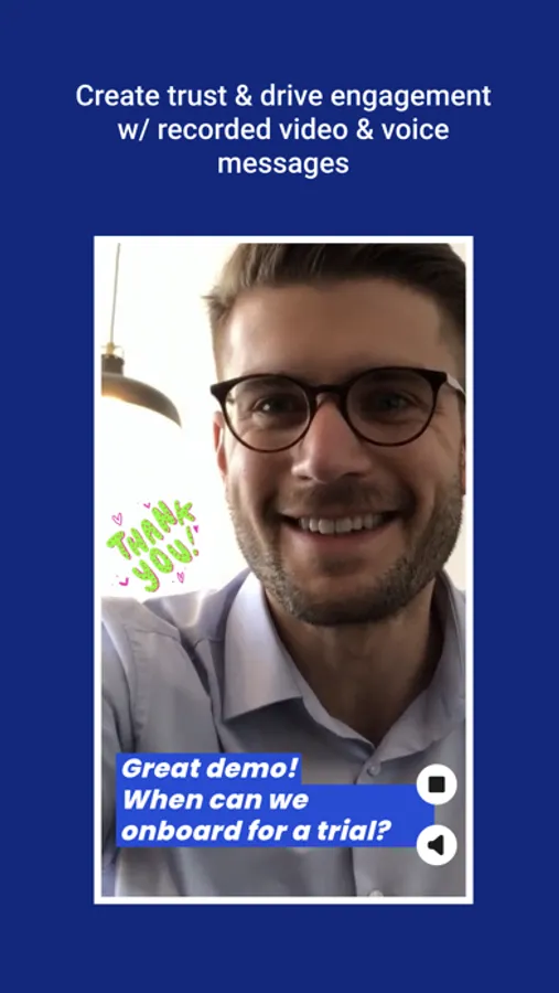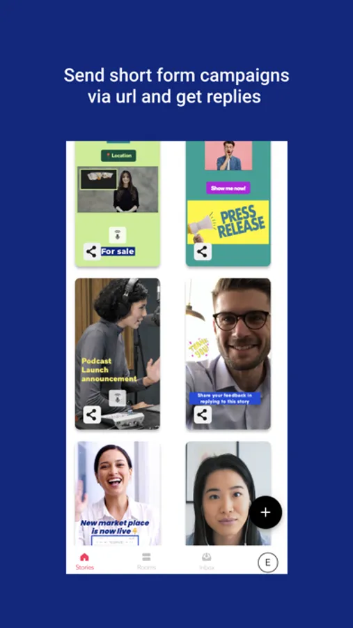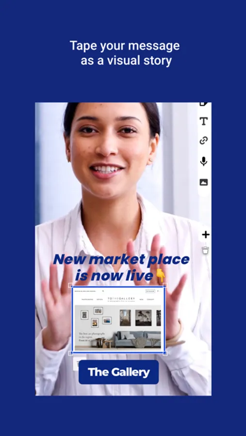 Video messaging enables to create visual stories. Audience replying will create a private channel for asynchronous conversations. Tape your message, add visuals, media, text and call-to-actions to engage your audience. Your tape can be shared as a simple URL on any channel: SMS, messaging, landing pages.