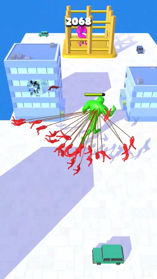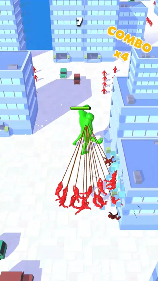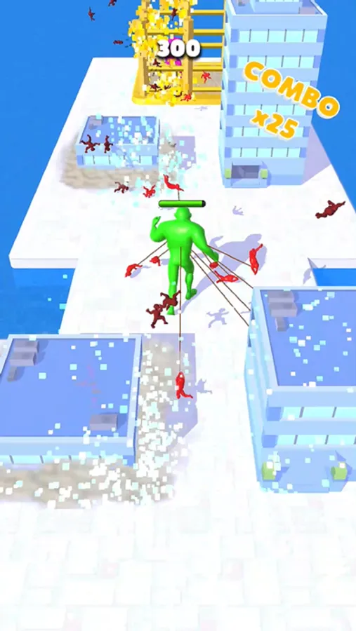 But beware of the red enemies on the ground: they'll try to stop you! So send them away or crash them into buildings to be free of them!
