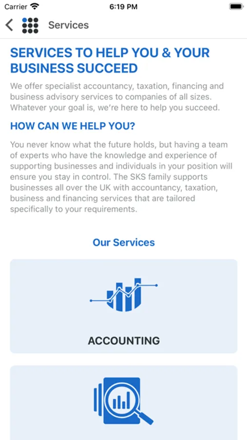 All the latest tax & business tools at your fingertips! At SKS we continue to help our clients grow and succeed with our new app. We offer specialist accountancy, taxation, financing and business advisory services to companies of all sizes. Whatever your goal is, we’re here to help you achieve it.