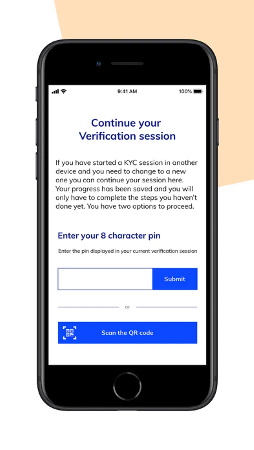 Customers can continue their verification session on a different device to utilize better camera quality and/or more comfortable input. For example, your client can start the verification procedure by filling the questionnaire on their computer and finish it on their mobile phone, taking a photo of their document and a selfie.