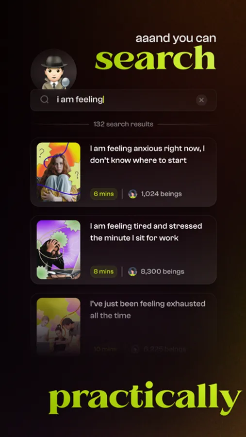 a mini-therapy is a bite-sized therapy-like interactive session — with a mix of audio-based counseling and tools/exercises — hyper-personalized for every user and their discomforts