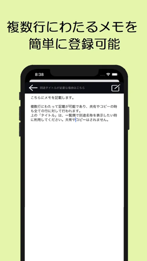シンプルなメモ帳であり、入力した情報を簡単に共有(シェア)・コピーして利用することができます。