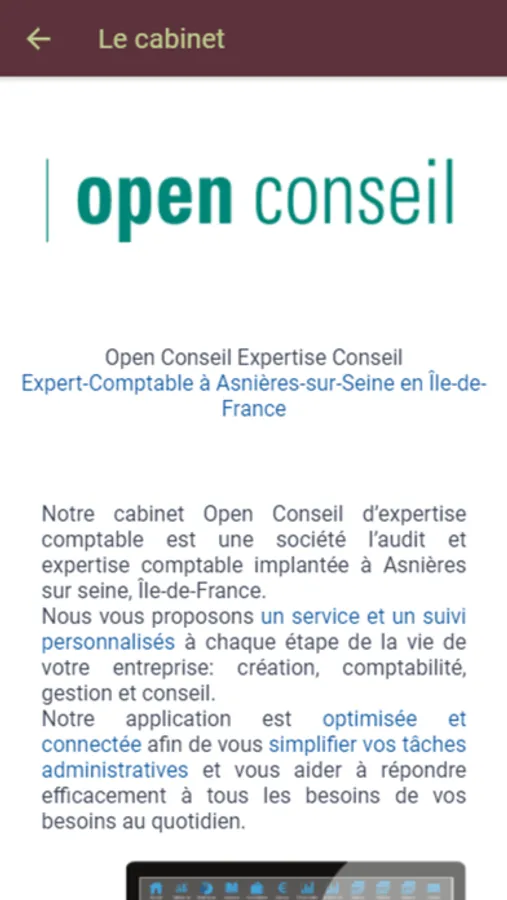 Notre application vous permettra d'accéder à votre comptabilité en ligne, à l'actualité juridique fiscale et sociale et de nous géolocaliser