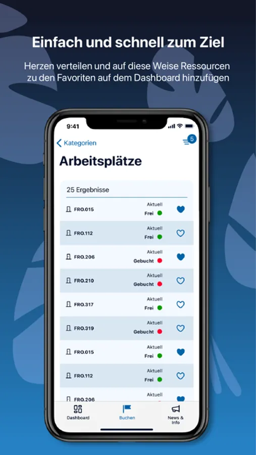 Mit der dReservierung-App haben Sie alle Ressourcen, die Ihnen ihre Organisation zur Verfügung stellt immer griffbereit. Auf diese Weise können Sie in Echtzeit sehen, welche Ressourcen wann gebucht sind und selbst Buchungen in der von Ihnen gewünschten Zeit tätigen. Damit Sie immer den Überblick behalten, werden Ihnen sämtliche Buchungen auf dem Dashboard angezeigt, die zu jedem Zeitpunkt auch wieder storniert werden können. Um den Buchungsprozess Ihrer Lieblingsressourcen noch einfacher und schneller zu gestalten, lassen sich diese kinderleicht zu den Favoriten hinzufügen. dReservierung macht es Ihnen so leicht den eigenen Arbeitsalltag in wenigen Minuten zu strukturieren.