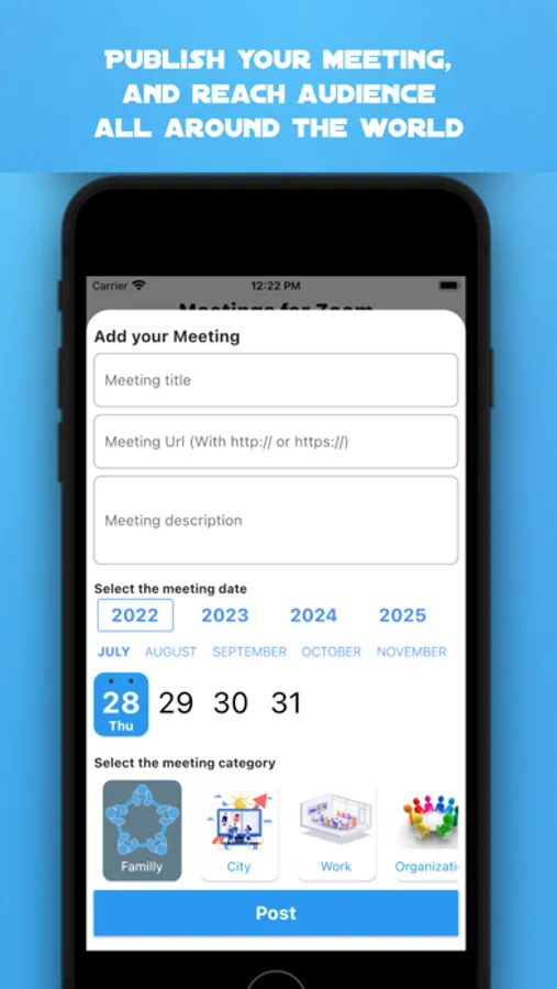 Meeting & Webinar apps help people to do meetings all over the world with group in high quality. meetings and webinars are grouped now per category. You can easily find, schedule, join or post : Family meetings, City meetings, Organization meetings, Course meetings, Training meetings, Information meetings, Support meetings, Games meetings, Dating/Love meetings, Event meetings, ...