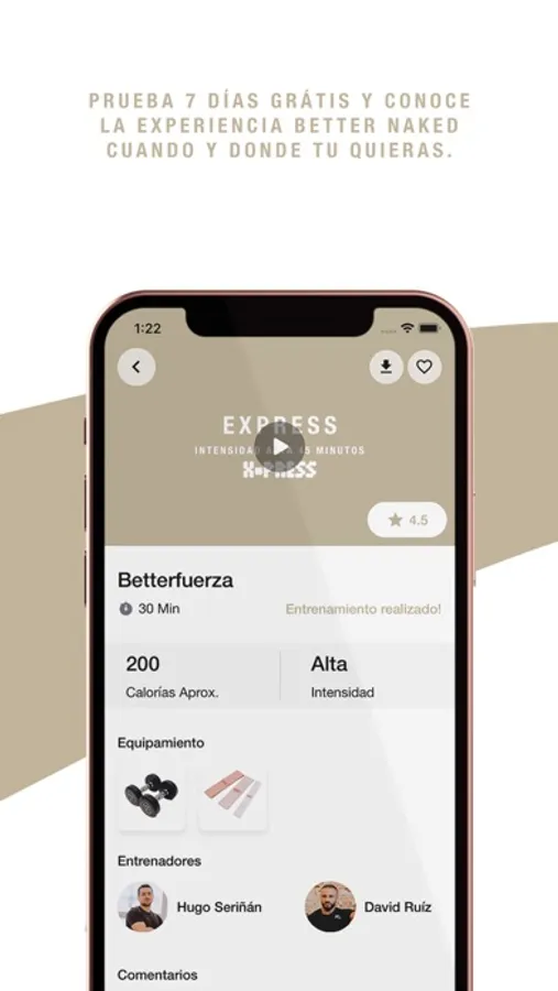 Prueba 7 días gratis sin tener que realizar ningún pago y conoce la experiencia Better Naked cuando y donde tú quieras. Conseguirás tu objetivo de ganar más muscular, perder grasa, fortalecer músculos gracias a nuestros planes.