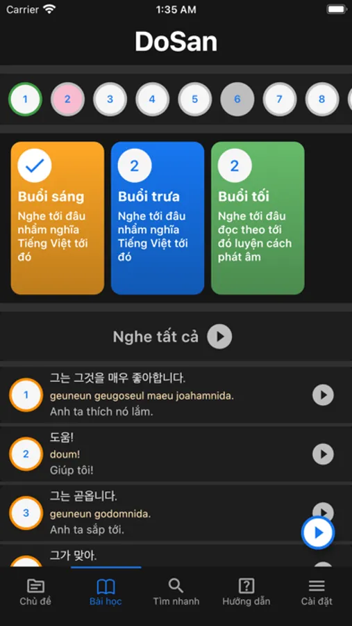 Ngay sau đây, DoSan mang đến một giải pháp mới giúp bạn học giao tiếp Tiếng Hàn phản xạ vô điều kiện, mà không cần phải nổ lực gì cả, dễ lắm, chỉ cần siêng năng, kiên trì là được. Theo đại học Oxford, để đọc viết tốt một ngoại ngữ bạn chỉ cần dùng khoảng 3000 từ vựng, thì để giao tiếp thường đàm hằng ngày chúng ta cũng chỉ cần dùng khoảng 1000 câu đàm thoại ngắn.