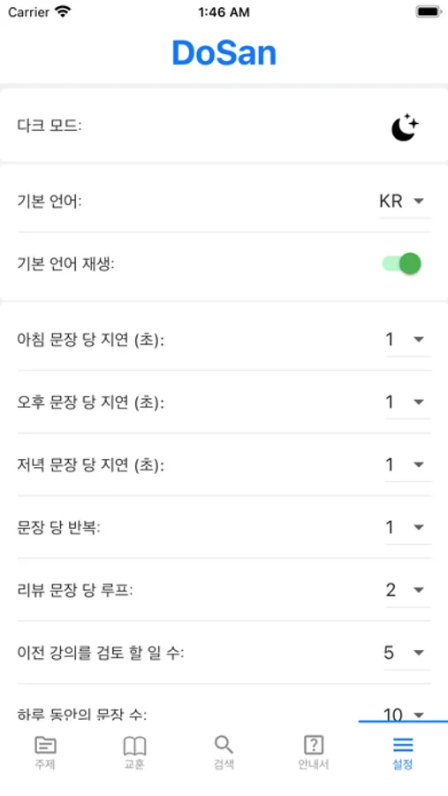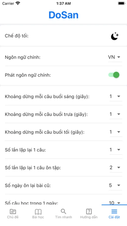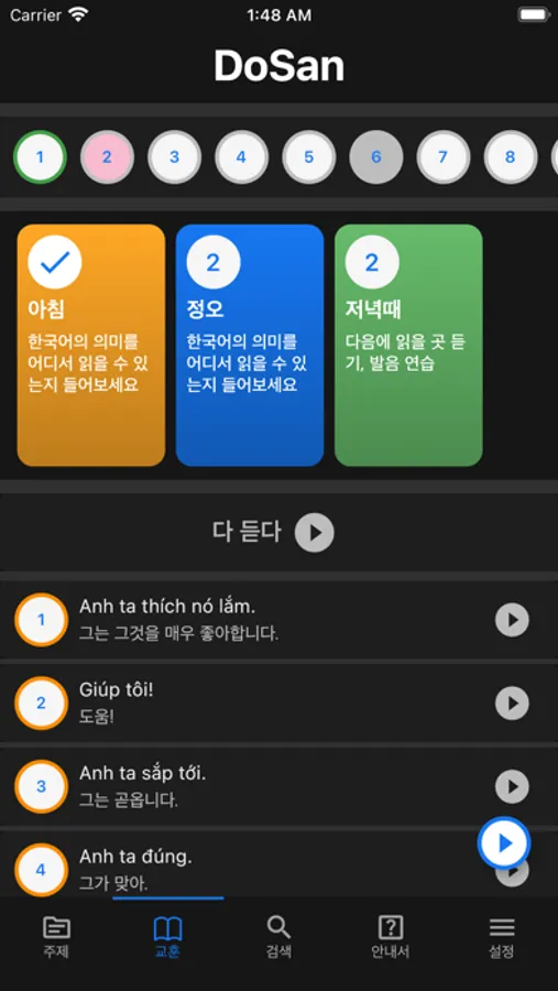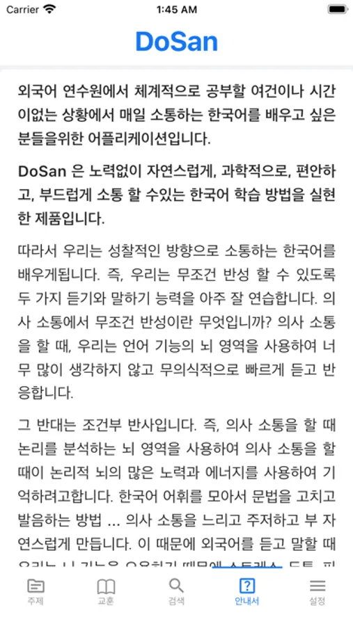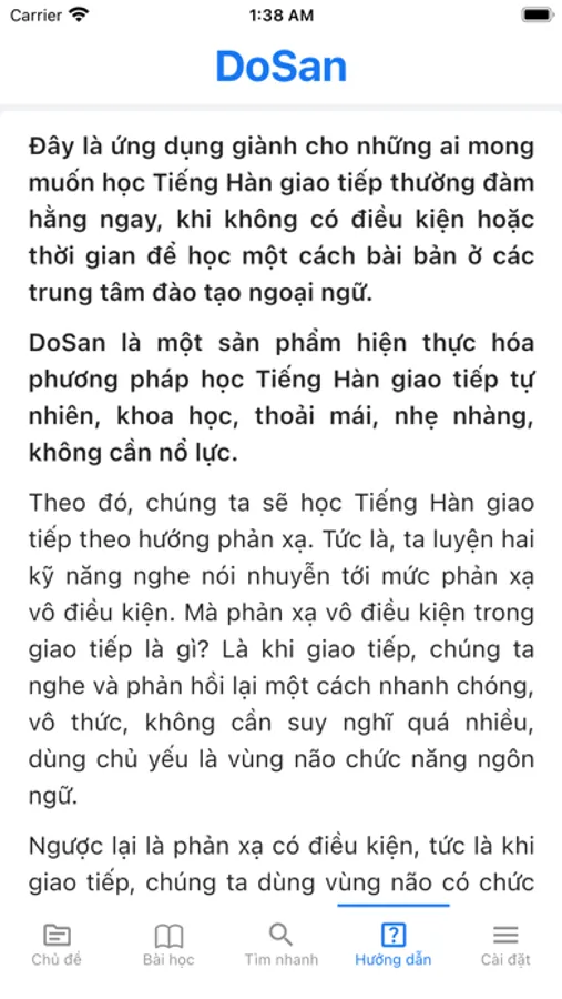 DoSan là ứng dụng miễn phí, mong muốn giúp mọi người có thể học Tiếng Hàn giao tiếp một cách thoải mái hơn, phản xạ hơn và ngày càng thành công trong cuộc sống. Chúc vui vẻ.