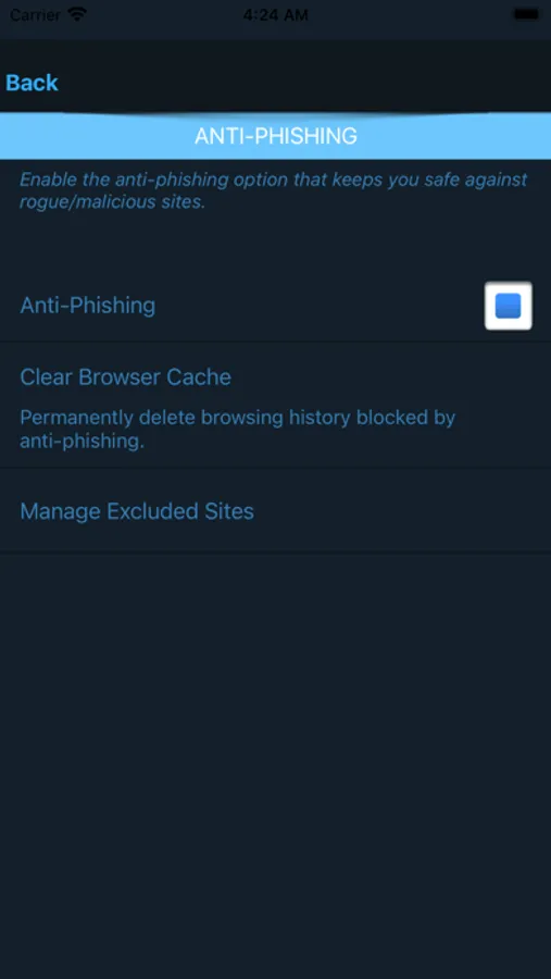 Antiphishing - protects you from entering phishing (fraudulent and malicious) sites and thus eliminating the possibility of getting your credit and plastic cards, phone numbers, personal data into the hands of cybercriminals.