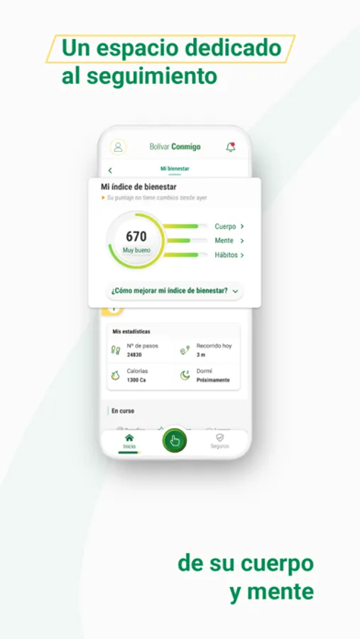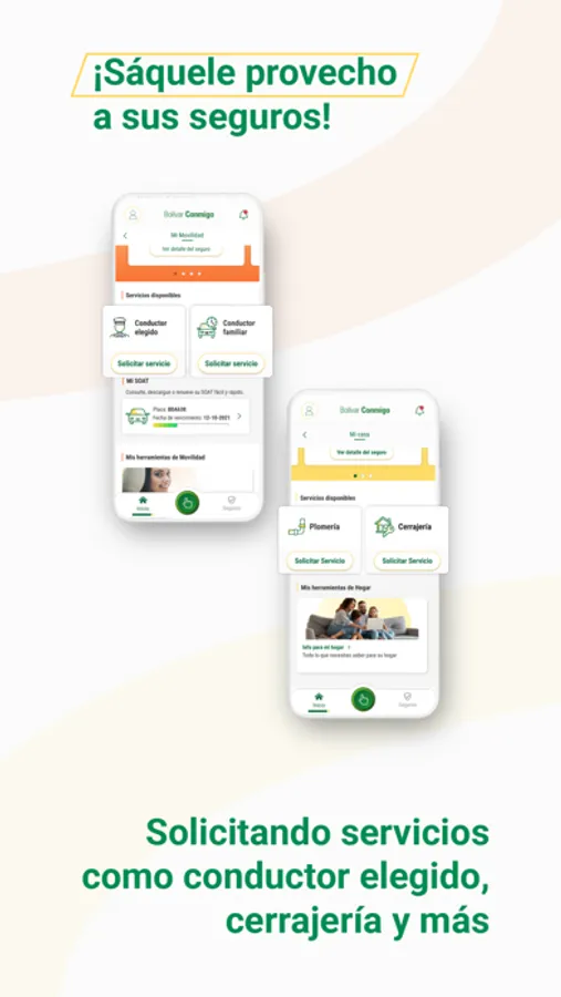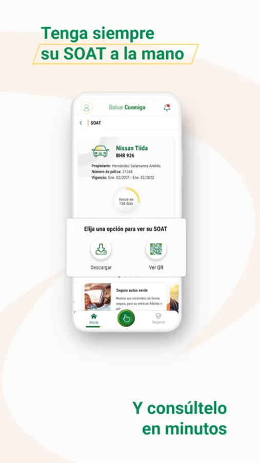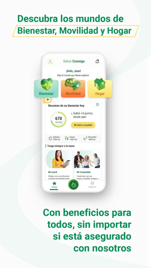 Con nuestra súper app de Bolívar Conmigo, usted abrirá la puerta a una nueva y sencilla forma de integrar su mundo de bienestar y de movilidad, en un solo lugar. Y lo mejor, sin importar si tiene o no un seguro con nosotros. ¿Un super plus?, nuestro Botón Verde, disponible en caso de cualquier emergencia médica, si se vara o está en alguna situación que requiera nuestra asistencia.