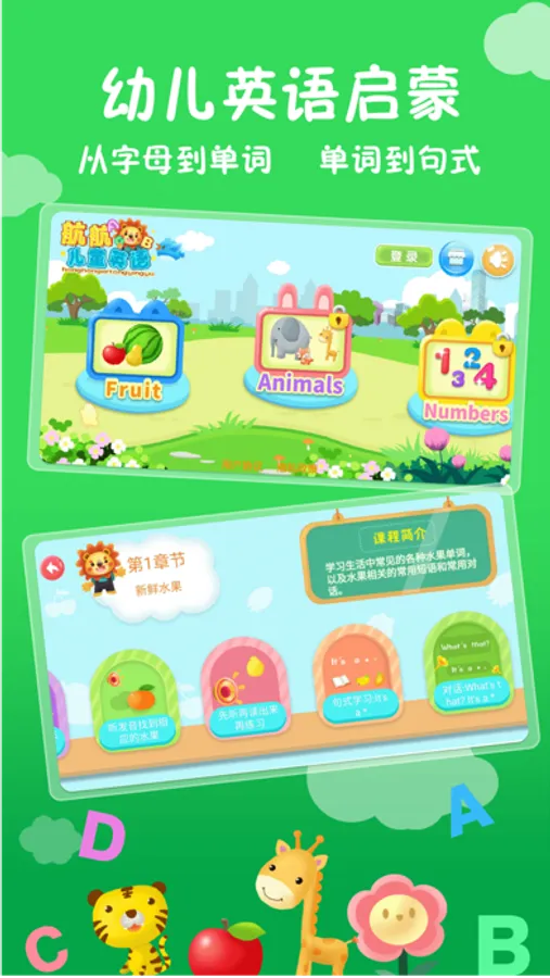 儿童英语是为3-8岁的儿童开发的英语学习软件,课程内容包含14个日常生活中的常见场景的英语学习,包括水果、动物、数字、颜色、家人、交通工具等14个章节,每个章节包括10多节课程。每个章节的内容,包括该场景下的单词、语句、对话,所有课程300+单词,100+语句,200+对话以及26个字母。该软件秉承认、听、读、写的理念,先认识,再听得懂,然后能够读出来,最后还能写出来,让小朋友循序渐进的学习英文。软件内容以互动形式展现,激发小朋友学习英语的兴趣,内容丰富有趣,小朋友学习英语的过程中不再枯燥乏味,是小朋友学习英语启蒙的好帮手。