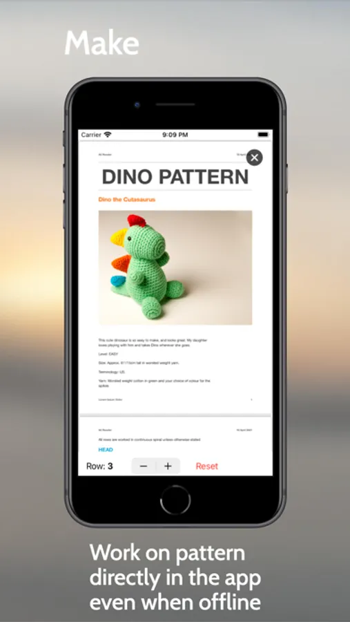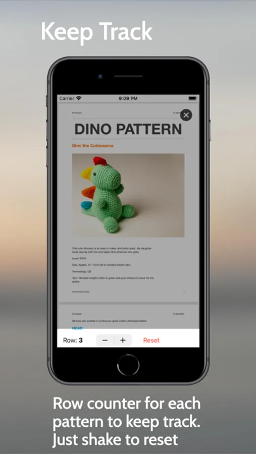 Each full pattern has a convenient row counter to help you keep track of where you are in the pattern. This is remembered each time you come back to the pattern so you will always know where you are up to. The row counter can be reset using Reset button, or by shaking your iPhone or iPad.