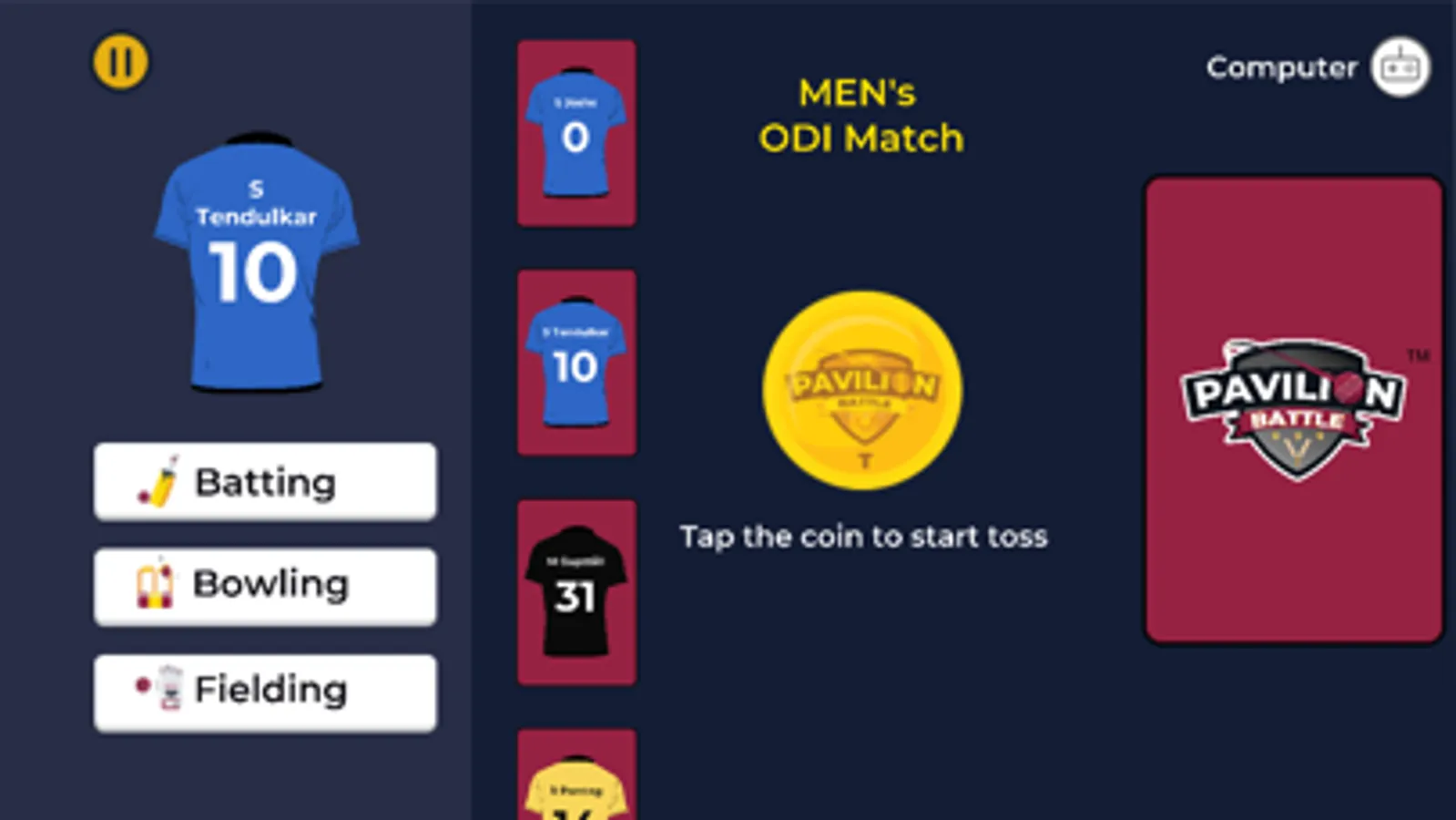 Pavilion Battle is a mobile game application using simulated cricket data and graphics