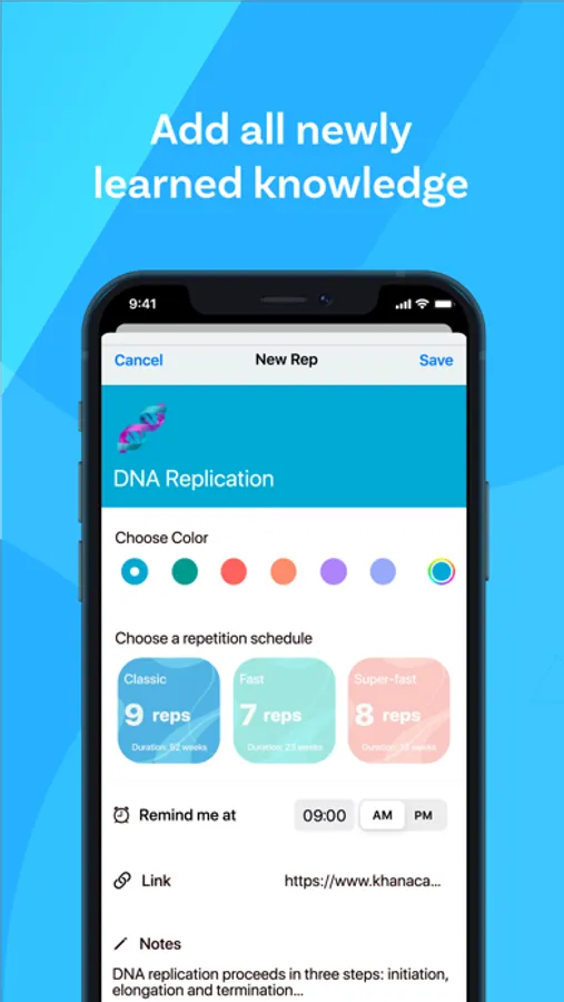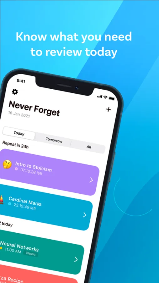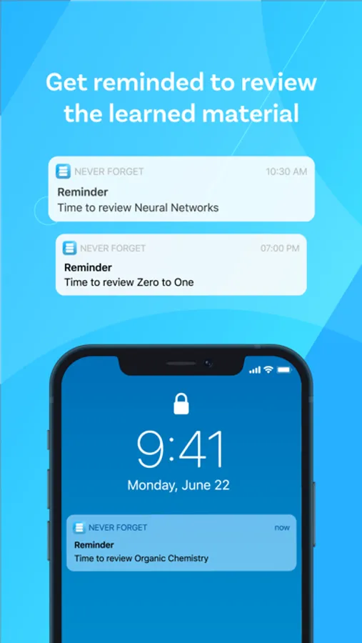 Never Forget reminds you when to review information based on a powerful and effective learning method to retain information called Spaced Repetition. It helps to improve your brain’s ability to recall what you study.