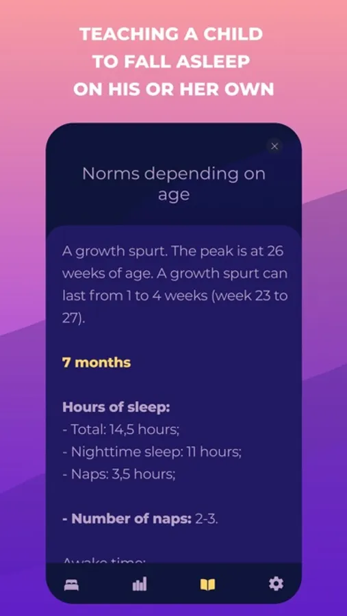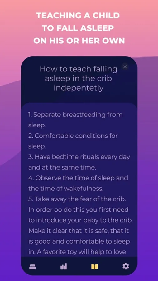 Ideas and tips on how to quickly put your baby to sleep and reduce the number of night awakenings, how to teach a child to fall asleep in his or her crib, how to avoid rocking him or her to sleep, how to separate breastfeeding and sleep. The app is designed for young parents and can replace an expensive sleep consultant.