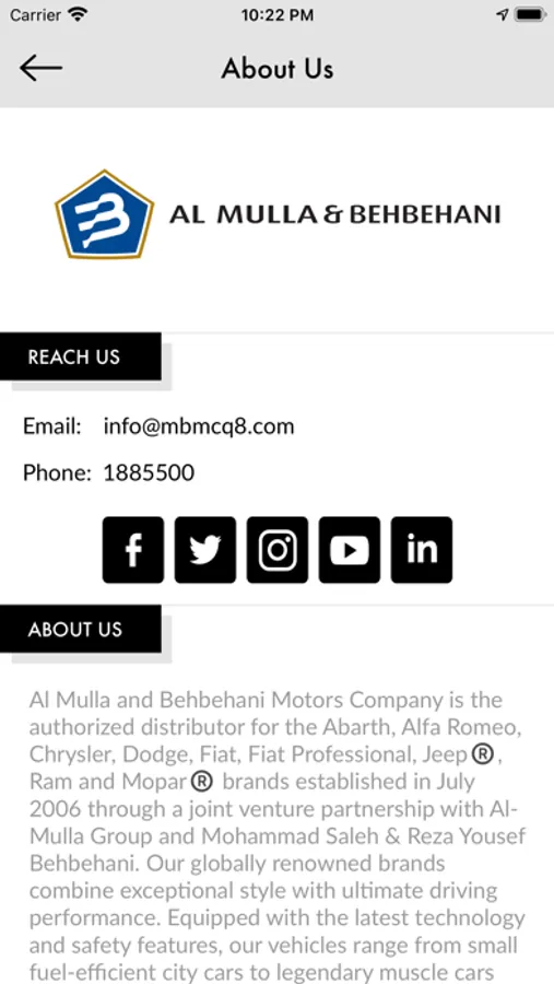 Al Mulla & Behbehani Motor Company WLL is the authorized distributor for Alfa Romeo, Abarth, Chrysler, Dodge, Fiat, Jeep ®, Ram and Mopar ® brands. Established in April 2006 through a joint venture partnership by Al-Mulla Group (at the time Distributor for Chrysler and Dodge brands for 40 years) and Behbehani Jeep Motor Company (at the time Distributor for Jeep brand for 16 years), Al Mulla & Behbehani has continued to excel each year. With decades of automotive experience behind the two companies, the unification of the sales and service offered operations the opportunity to increase market share as well as providing added value to customers in terms of enhancing service levels throughout the operations.