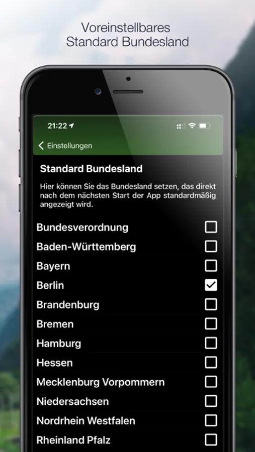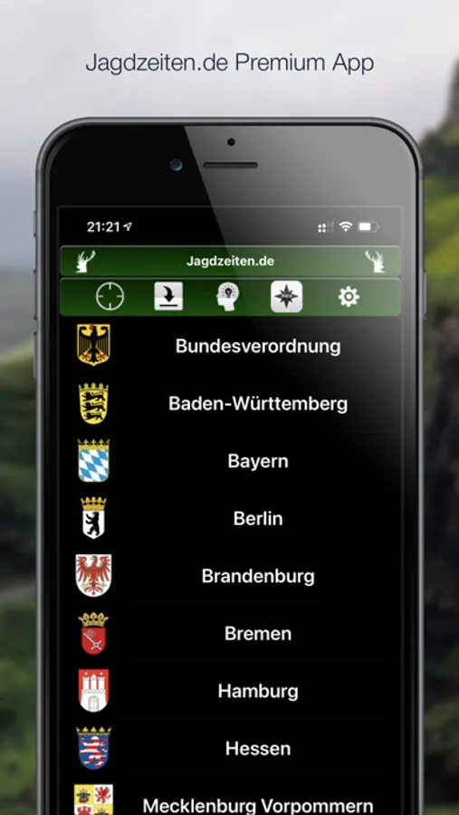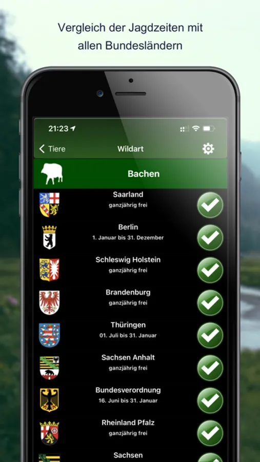Folgende Bundesländer sind in der App enthalten: Schleswig Holstein, Bremen, Niedersachsen, Mecklenburg Vorpommern, Rheinland Pfalz, Baden Württemberg, Bayern, Hessen, Berlin, Hamburg, Sachsen, Sachsen Anhalt, Brandenburg, Nordrheinwestfalen (NRW) sowie die Bundesverordnung (Bundesjagdgesetz)